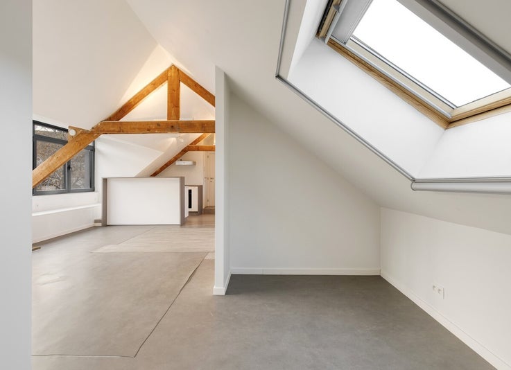 De gemeenschappelijke traphal leidt ons naar de dakverdieping van het kleinschalige appartementsgebouw, zonder vaste maandelijkse kosten. De inkomhal van de studio geeft toegang tot een apart toilet en handige berging. De keuken beschikt over enkele ingebouwde toestellen: oven, vaatwas, koelkast, kookplaat en dampkap. Dankzij de grote raampartijen is de leefruimte zeer lichtrijk en heeft deze een prachtig uitzicht op authentieke gebouwen, waaronder de Kluizekerk, en enkele volwassen bomen.