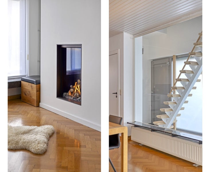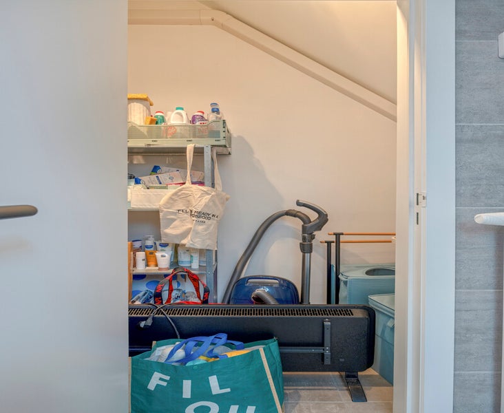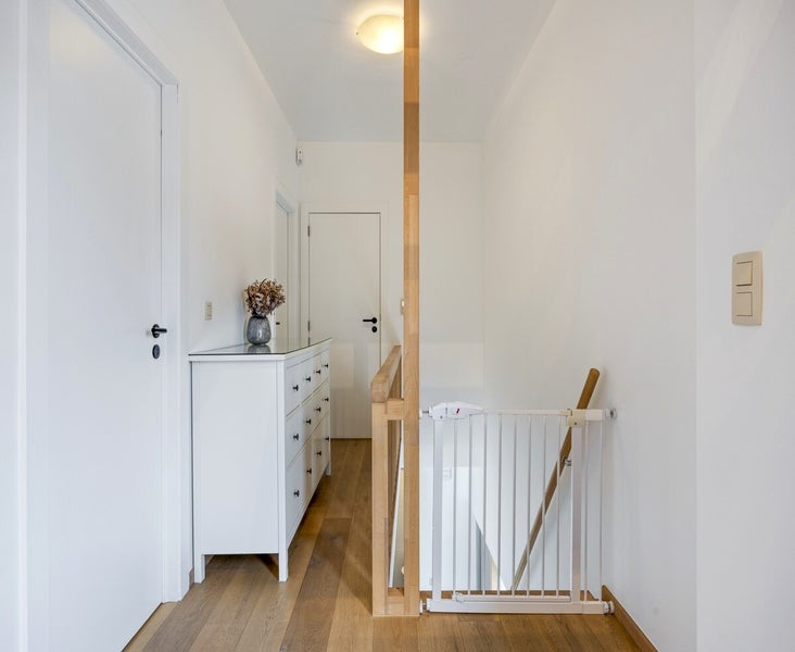 We betreden de woning via de inkomhal met vestiaire en gastentoilet. Dankzij de zeer grote raampartijen is de leefruimte zeer lichtrijk. De gashaard maakt deze ruimte eens zo gezellig tijdens koude dagen. De leefkeuken met eiland kijkt uit over de tuin en is voorzien van allerhande ingebouwde toestellen: oven, combi-oven, vaatwas, inductiekookplaat, Amerikaanse koelkast,... Aansluitend is er een handige (was)berging.