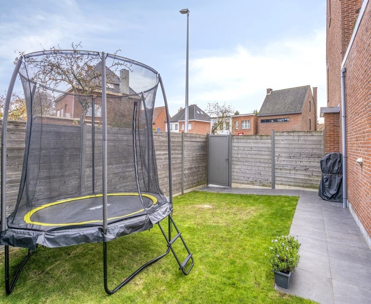 De groene tuin werd zeer onderhoudsvriendelijk aangelegd en heeft een ruim terras. Dit geeft toegang tot de garage achteraan het perceel. Ook de oprit biedt plek voor een extra wagen.