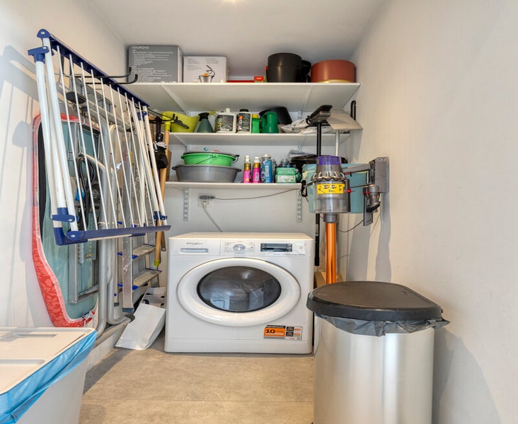 We betreden de woning via de inkomhal met gastentoilet. De leefruimte is dankzij zijn grote raampartijen zeer lichtrijk. De open keuken met eiland kijkt uit over de tuin en is voorzien van allerhande ingebouwde toestellen: oven, combi-oven, koelkast, vriezer, vaatwas, inductiekookplaat en dampkap,... Aansluitend is er nog een handige berging met aansluiting voor een wasmachine.