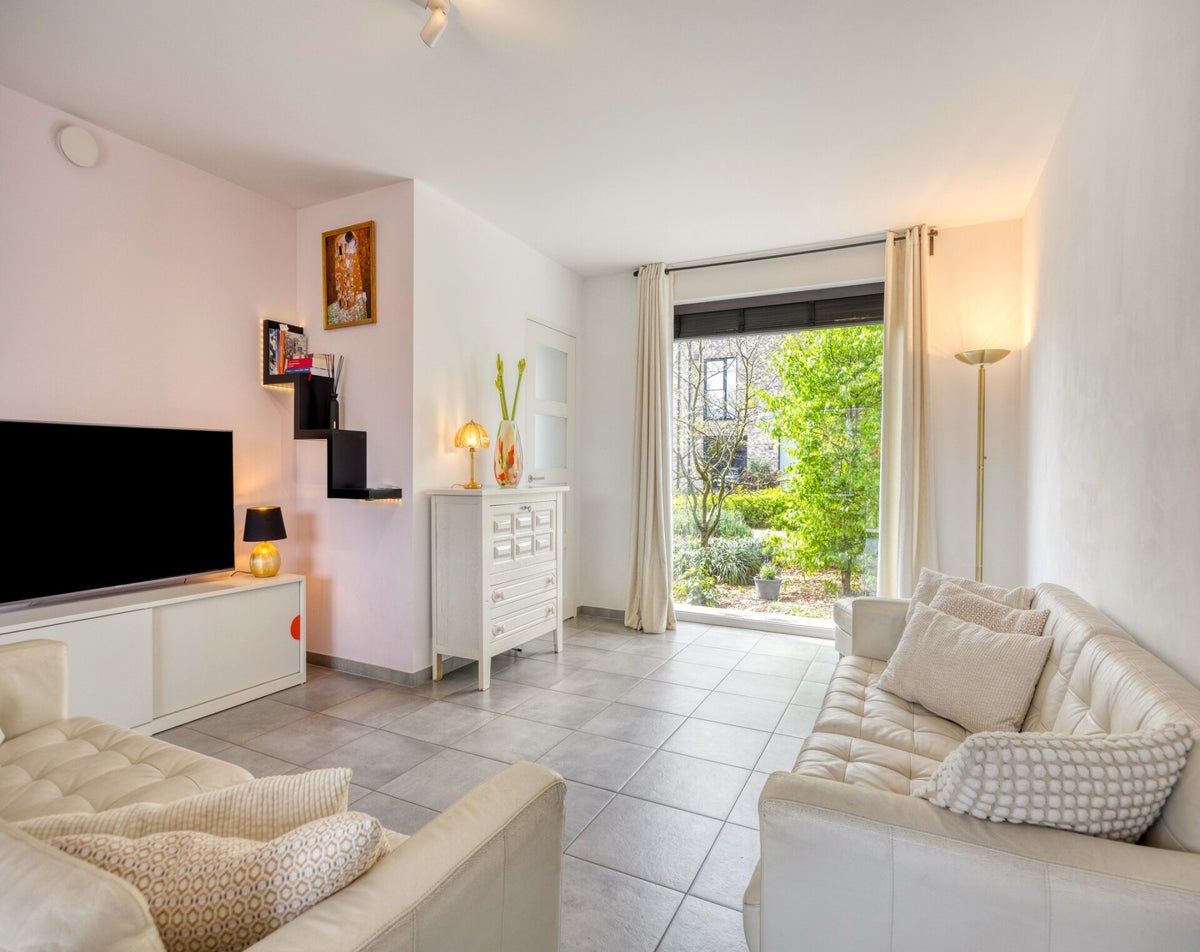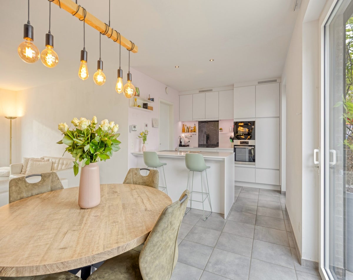 Via de inkomhal met vestiaire en gastentoilet komen we de woning binnen. De leefruimte geniet dankzij de grote raampartijen van veel natuurlijk licht en biedt een mooi zicht op zowel de voor- als achtertuin. De open keuken is volledig uitgerust met ingebouwde toestellen, waaronder een oven, vaatwasser, microgolfoven, koelkast en inductiekookplaat. Aansluitend bevindt zich een ruime berging met aansluiting voor wasmachine. Deze is bereikbaar vanaf de oprit, wat het gemakkelijk maakt om boodschappen naar binnen te brengen.