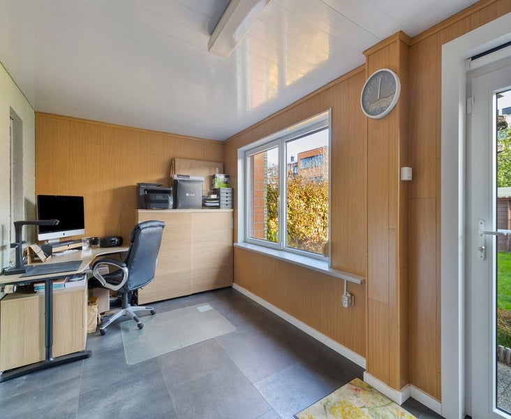 We betreden de woning via de inkomhal met gastentoilet. Meteen links bevindt zich de garage met achterliggende berging/technische ruimte. Op het gelijkvloers situeert zich een eerste slaapkamer/bureau/thuiskantoor/studio/hobbyruimte van ca. 16m² met zicht op de tuin. Er is een nieuwe badkamer met ligbad en lavabo met aansluitend de wasberging. De zonnige en onderhoudsvriendelijke tuin beschikt over een handig tuinhuis.