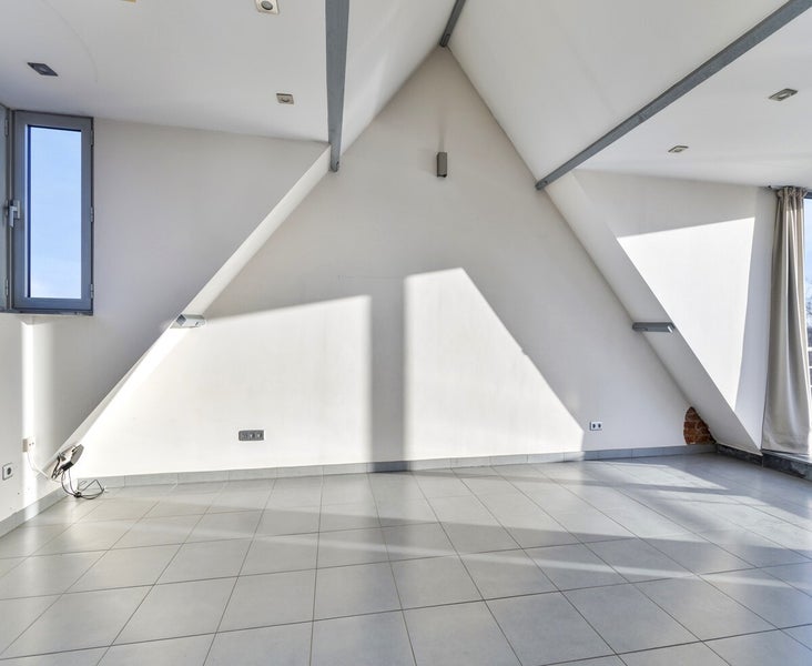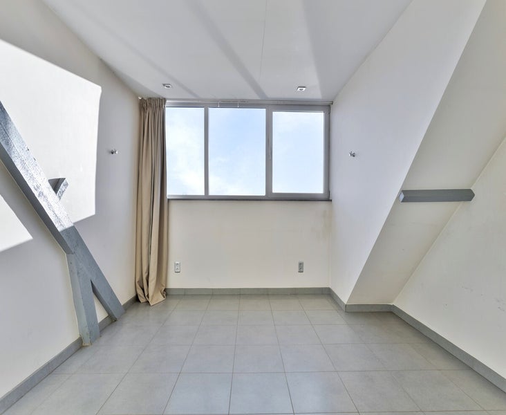 De ingang van het appartement bevindt zich op de tweede verdieping van het gebouw. Met een private trap bereiken we de open inkomhal met apart toilet op de derde verdieping. De leefruimte is zeer lichtrijk dankzij de vele grote lichtpartijen. De open keuken werd uitgerust met alle nodige toestellen: gasvuur met dampkap, vaatwas, oven en koelkast.