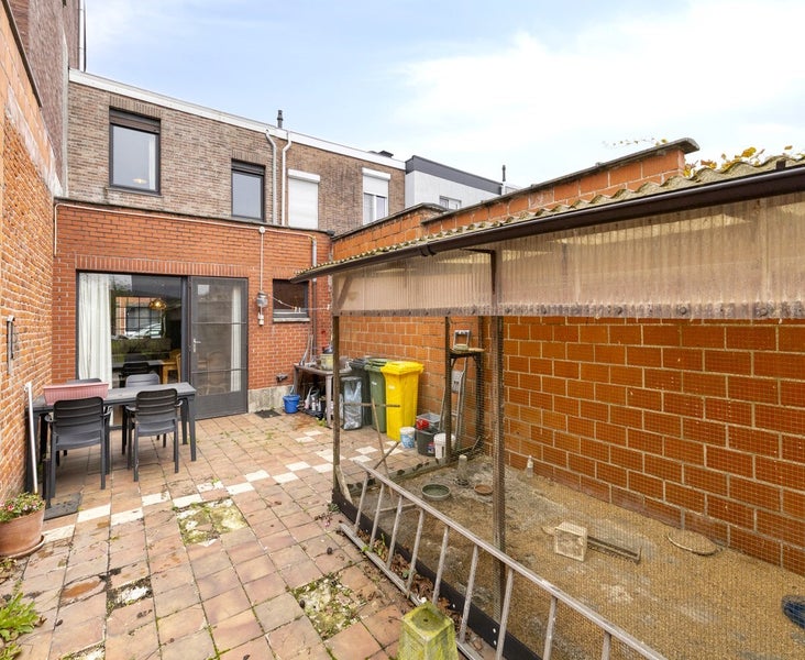 De woning heeft een zonnige zuidwest-tuin van ca. 165m². Deze werd groen aangelegd en is reeds voorzien van een tuinberging. Achteraan de woning ligt een ruim terras. De achteringang (servitudeweg) geeft uit op de parking van supermarkt Carrefour en is ideaal te gebruiken voor fietsen.