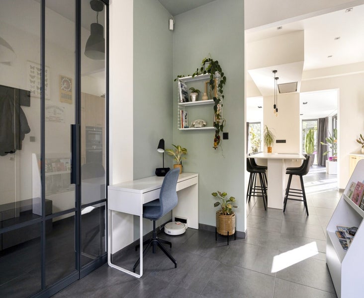 We betreden de woning via de inkomhal met apart toilet. Vooraan bevindt zich een bureauruimte en technische ruimte met aansluiting voor wasmachine. Aansluitend de leefkeuken met allerhande ingebouwde toestellen: oven, combi-oven, vaatwas, koelkast, diepvries, inductiekookplaat,... De ruime woonkamer is extra gezellig dankzij de recente gashaard (2018) en kijkt uit over de zonnige tuin.