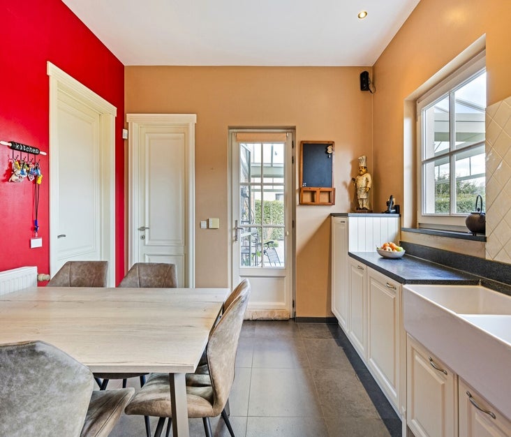 We betreden de woning via de statige inkomhal met apart toilet en vestiaire. Meteen links bevindt zich een bureauruimte (ca. 11,5m²) die uitgeeft op de leefruimte. Dankzij de grote raampartijen en hoog plafond (ca. 2,90m) is de ruime woonkamer zeer lichtrijk. De keuken is voorzien van veel kastruimte en de nodige inbouwtoestellen: oven, vaatwas, 5-pits gasvuur en dampkap, koelkast, dubbele spoelbak,... Op het gelijkvloers is een garage voor 1 wagen met aansluitend een afzonderlijke wasberging. Ook de trap naar de droge kelder bevindt zich hier.