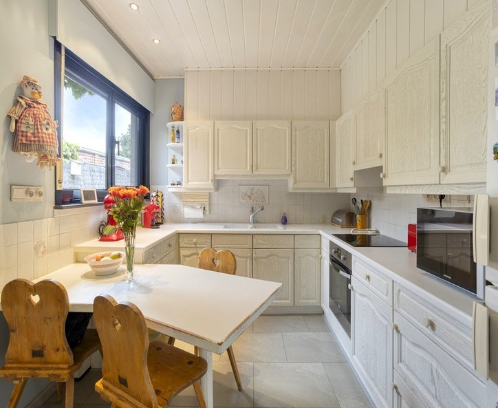 We betreden de woning via de inkomhal die ons leidt naar de lichtrijke leefruimte met zicht op de groene voortuin. Aansluitend bevindt zich de keuken met gezellige ontbijthoek en ingebouwde oven, kookplaat met dampkap en dubbele wasbak.