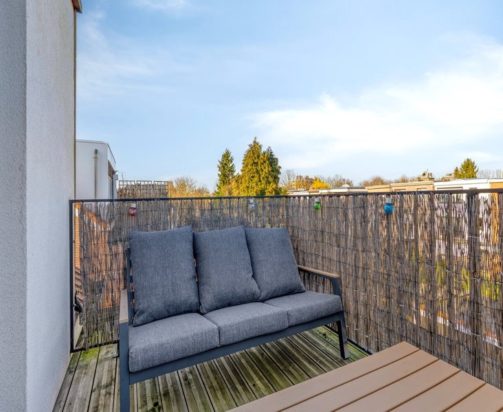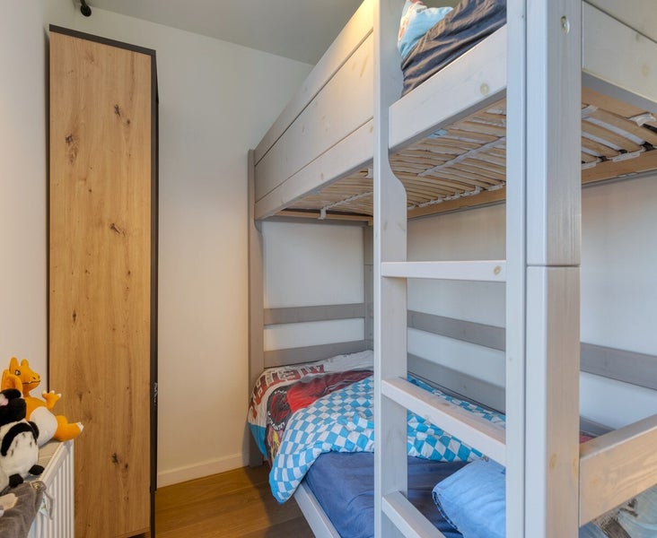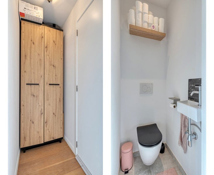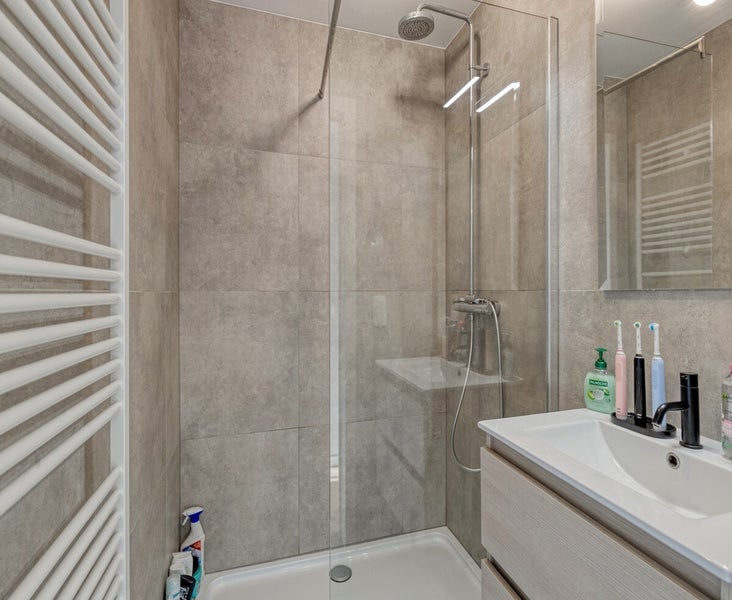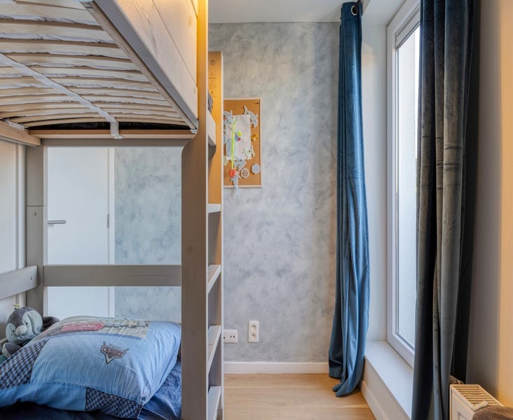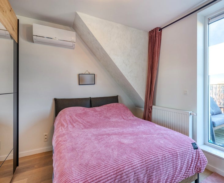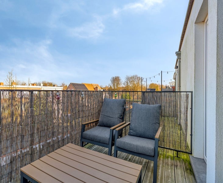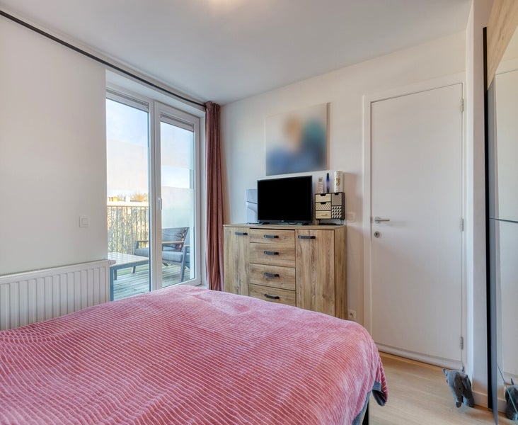 Er zijn 2 volwaardige slaapkamers (ca. 12m² en 6m²), beide voorzien van toegang tot het gezellige terras van ca. 8m². De badkamer werd uitgerust met een inloopdouche en lavabo. Er is een apart toilet. Plek voor de wasmachine vinden we in de daarvoor voorziene berging.