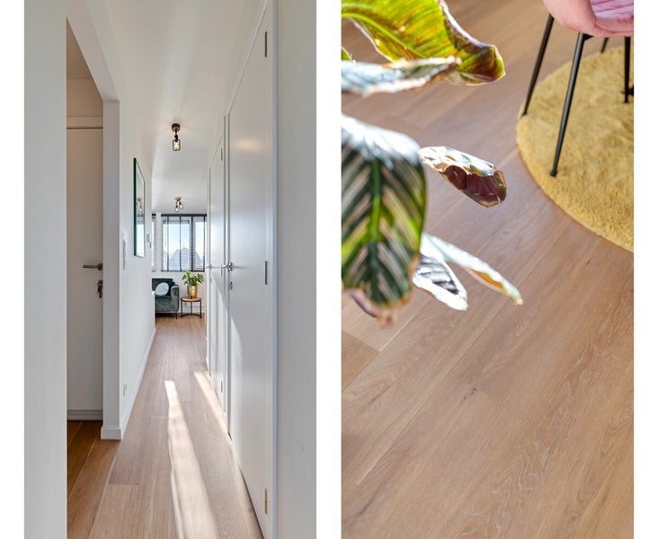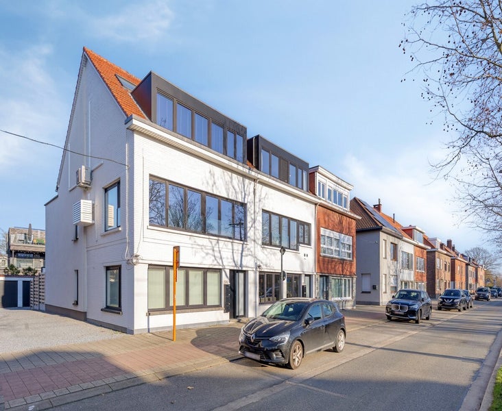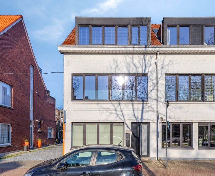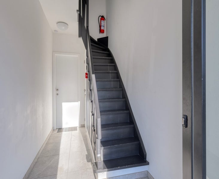 Het appartement vinden we op de tweede verdieping van een kleinschalig gebouw van 3 units. We betreden het appartement via de inkomhal met vestiaire. De leefruimte is dankzij de grote raampartijen zeer lichtrijk. De keuken werd voorzien van de nodige inbouwtoestellen: oven, koelkast, vaatwas, inductiekookplaat,...