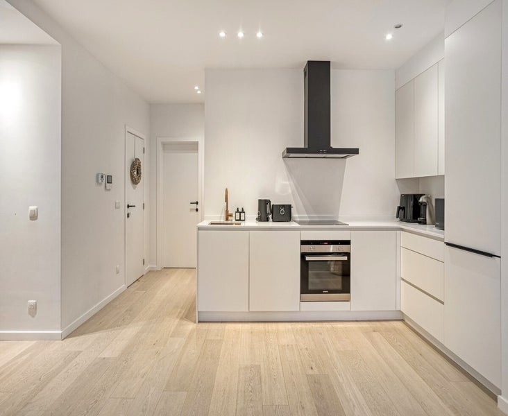 We betreden het appartement via de inkomhal met plek voor vestiaire. De open keuken beschikt over de nodige ingebouwde toestellen: oven, vaatwas, koelkast en vriezer, inductiekookplaat en dampkap. De leefruimte op parket is dankzij de grote raampartijen zeer lichtrijk en heeft een prachtig uitzicht over de tuin.