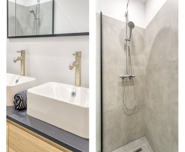 Er zijn 3 volwaardige slaapkamers waarvan één met toegang tot de buitenruimte. De badkamer werd uitgerust met een douche, dubbele lavabo en toilet. Er is een berging met aansluiting voor was- en droogmachine. De buitenruimte is dankzij de verharding zeer onderhoudsvriendelijk en geniet van avondzon. Deze kan men perfect meer privatiseren door een extra scheidingswand toe te voegen.