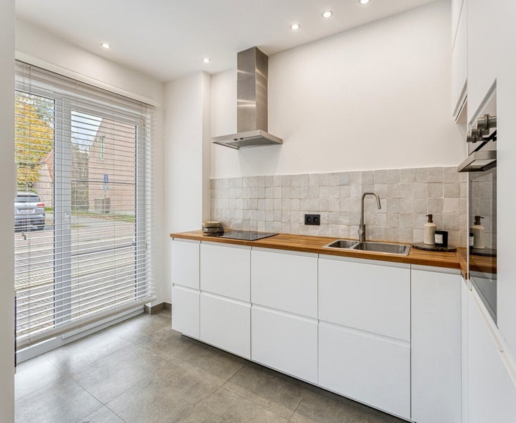 We betreden de woning via de inkomhal met ingebouwde vestiairekasten. De leefruimte is dankzij de grote raampartijen zeer lichtrijk. Aansluitende bevindt zich de open keuken voorzien van de nodige ingebouwde toestellen: oven, vaatwas, koelkast, vriezer en inductiekookplaat met dampkap.